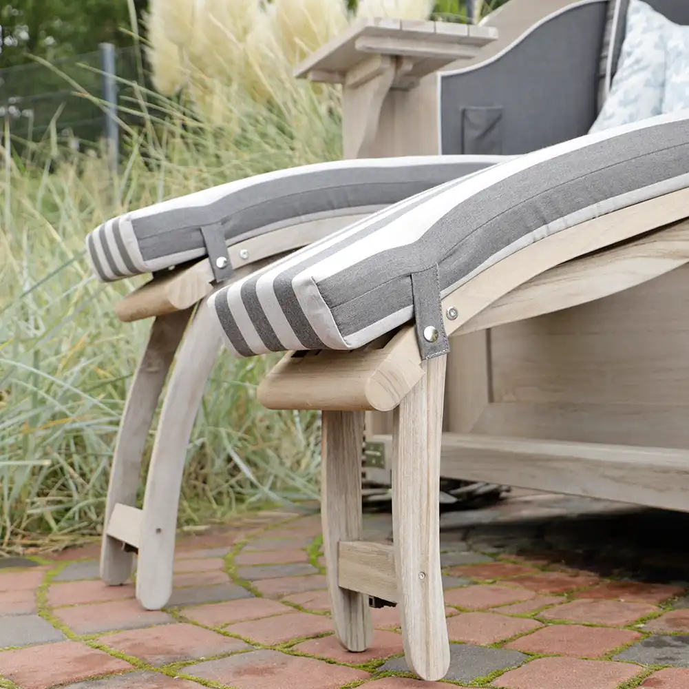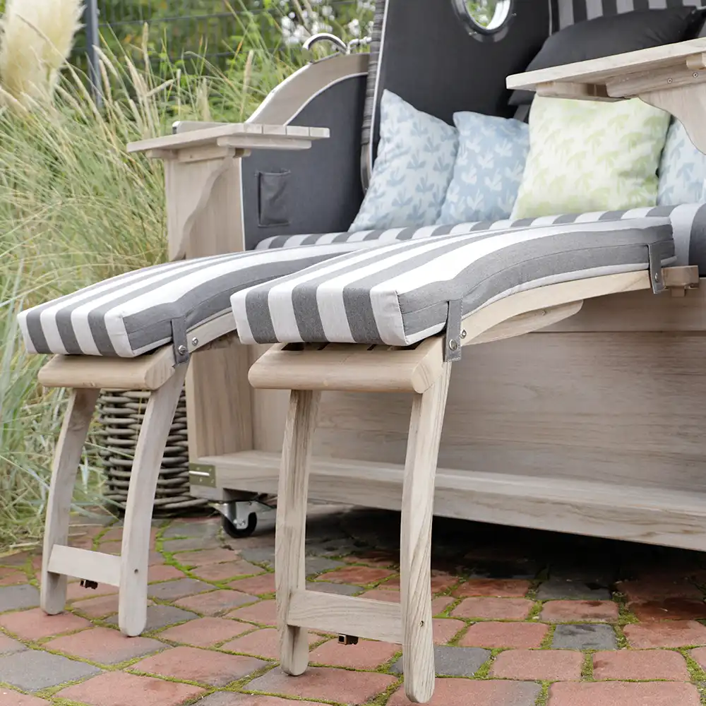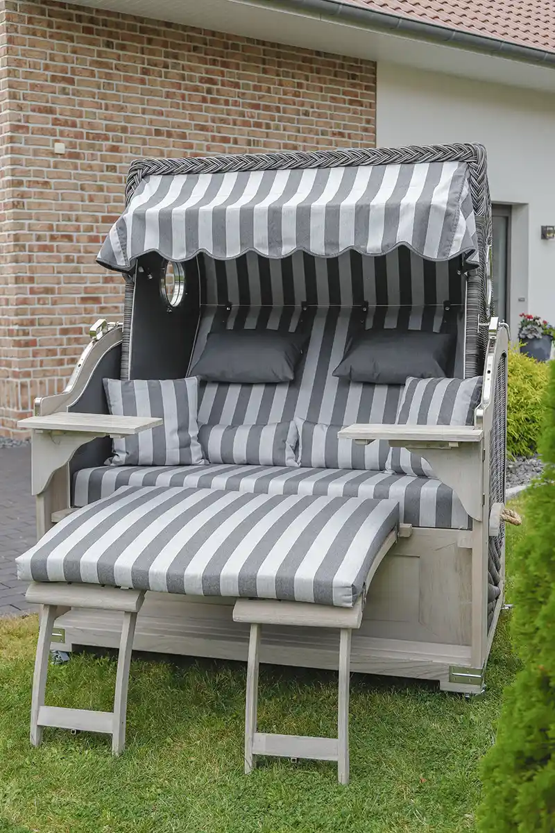Mit dem Strandkorb Kampen verwandeln Sie Garten, Terrasse oder Balkon in die perfekte Urlaubs-Oase. Genießen Sie entspannte Stunden im Grünen mit allem Komfort. Der hochwertige Volllieger überzeugt mit ausgewählten Materialien und vielerlei Annehmlichkeiten. Er wird aus robustem Teak-Holz und edlem PE-Geflecht gefertigt und ist wind- und wasserfest. Die im Lieferumfang enthaltene Abdeckhaube bietet Ihrem Outdoor-Möbel dauerhaften Wetterschutz. Für den Wellness-Faktor sorgen bequeme Polster, höhenverstellbare Fußablagen und der einfach zu verstellende Oberkorb. Mit dem praktischen Duo-Lifter wechseln Sie komfortabel zwischen Sitz- und Liegeposition. Die schwenkbaren Notebook-Tische bieten ausreichend Platz für Laptop, Bücher, Snacks und Getränke und in den Taschen an den Seiten des Strandkorbs lassen sich Zeitschriften und Smartphone verstauen. Ihren Traumstoff für den Strandkorb können Sie aus über 100 verschiedenen Stoffen wählen und dann heißt es: Platz nehmen und relaxen.
