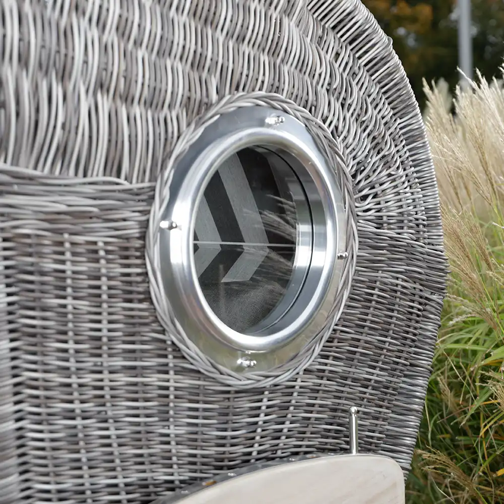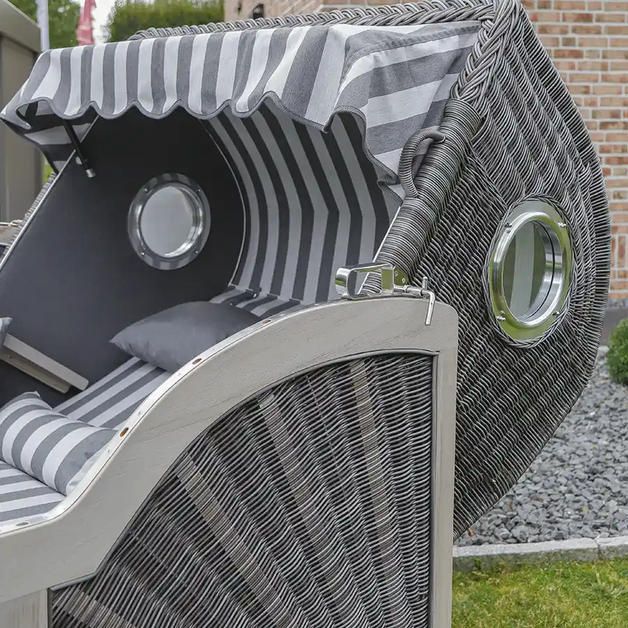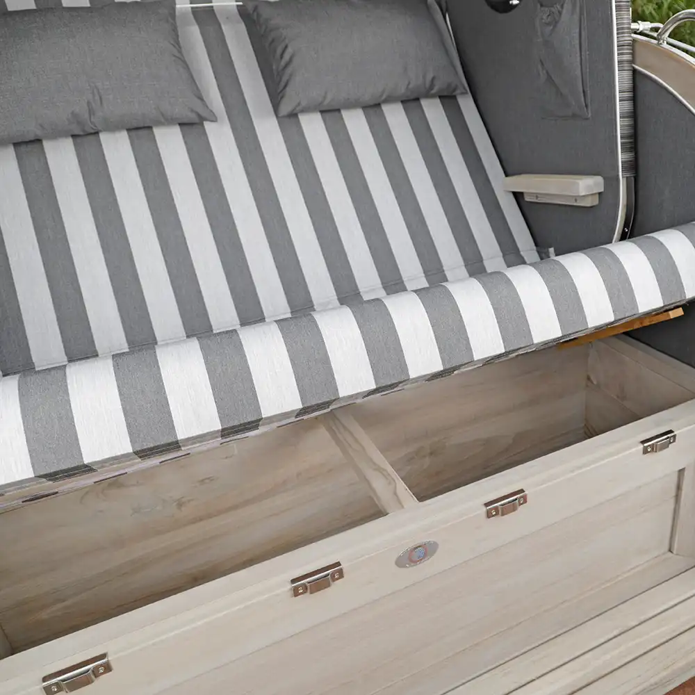 - Strandkorb ist durch Lösen von drei 17er-Schrauben in zwei Teile zerlegbar