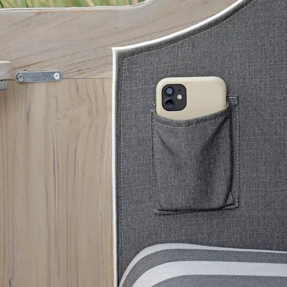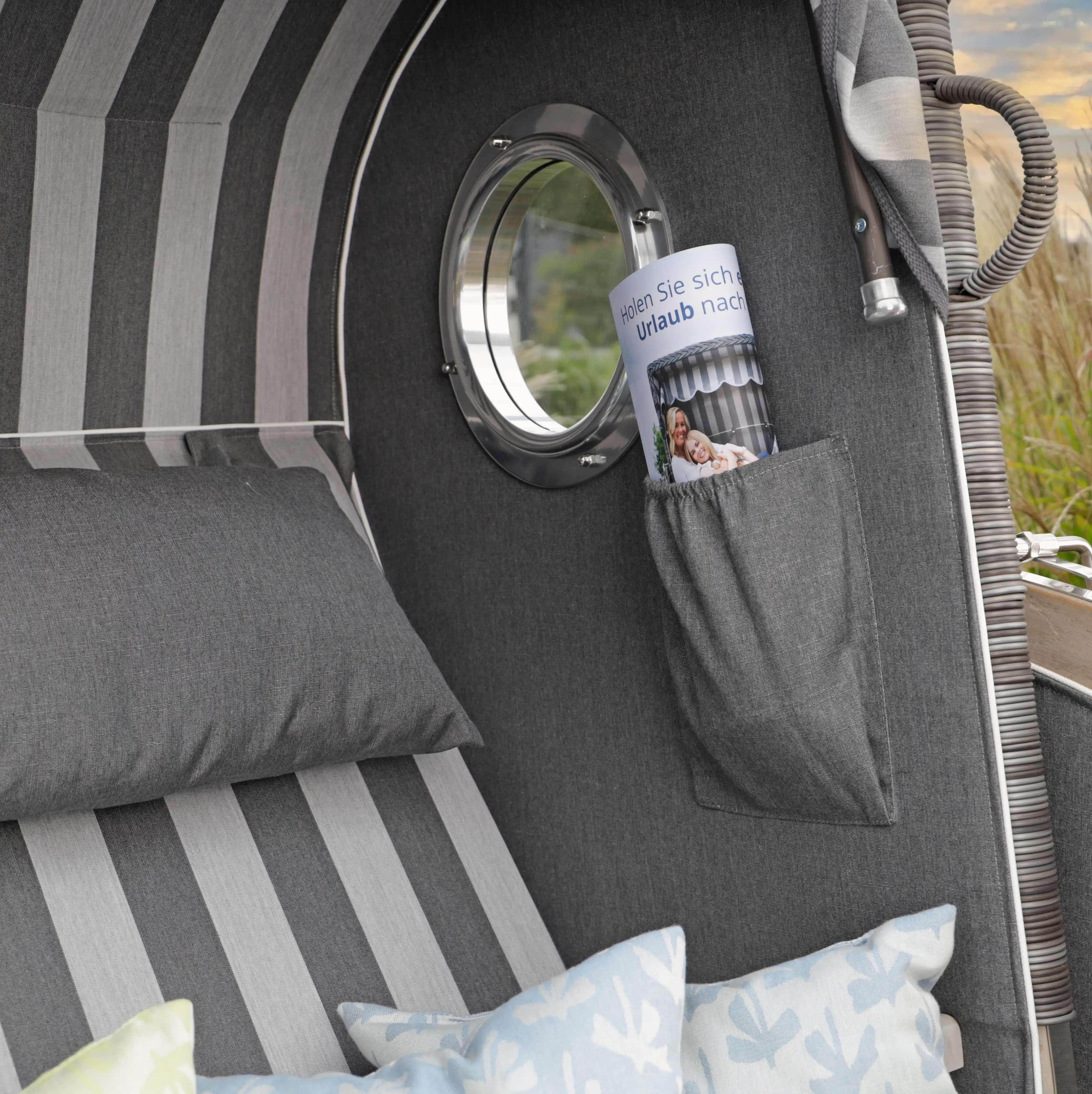 Bitte beachten Sie, dass bei den PVC-Stoffen entgegen der bildlichen Darstellung im Strandkorb keine Handy- und Zeitungstaschen vernäht sind.