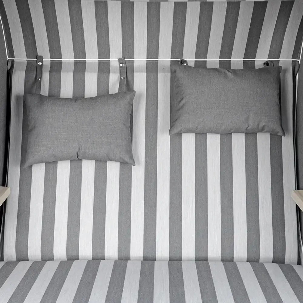 Der große Vorteil hierbei ist die Atmungsaktivität. Hierbei kann die eine auftretende Luftfeuchtigkeit stets im inneren zirkulieren und permanent austreten. Somit laufen Sie nicht Gefahr, dass es im inneren des Strandkorbes zu Feuchtigkeitsbedingten Stock-/Schimmelbildungen kommen kann. Zudem ist die Abdeckhaube im Schongang bei 30 Grad in der Waschmaschine waschbar.