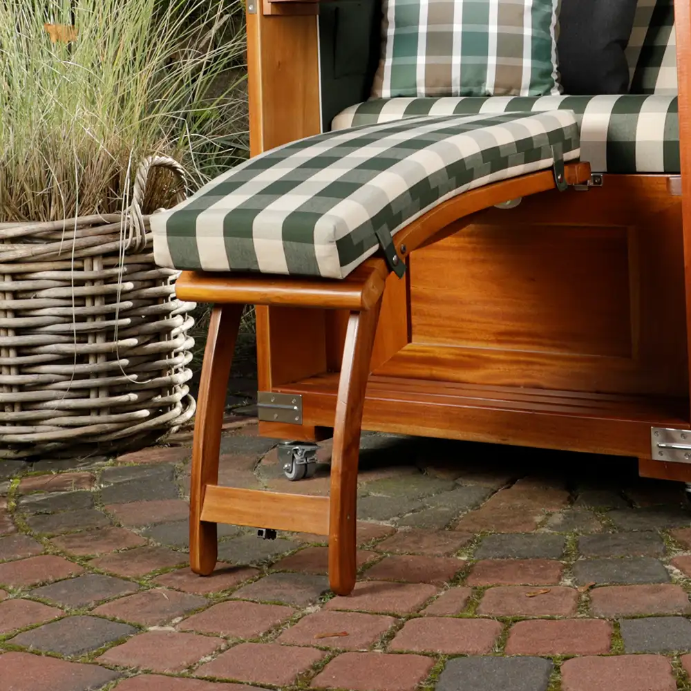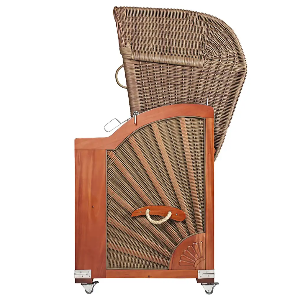Der Strandkorb „List Mahagoni“ ist ein luxuriöser Volllieger, der Ihnen bei wenig Platzbedarf größtmöglichen Komfort bietet. Das edle Mahagoniholz aus zertifiziertem und nachhaltigem Anbau wirkt in Kombination mit dem eleganten Sonnengeflecht als dekorativer Blickfang. Die geschwungene Form des Strandkorbs unterstreicht die zeitlose Eleganz und bildet zusammen mit dem edlen PE-Geflecht den passenden Rahmen für die hochwertigen Dralonstoffe. Für den extra Wohlfühlfaktor sorgen die dicken Polster und die höhenverstellbare Fußablage zum Einhängen. Auf dem seitlichen Klapptisch lassen sich Getränke sicher abstellen. Genießen Sie in diesem Strandkorb Ihre persönliche Auszeit vom Alltag, ob auf dem Balkon, auf der Terrasse oder im Garten.